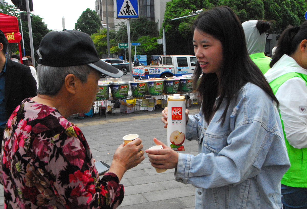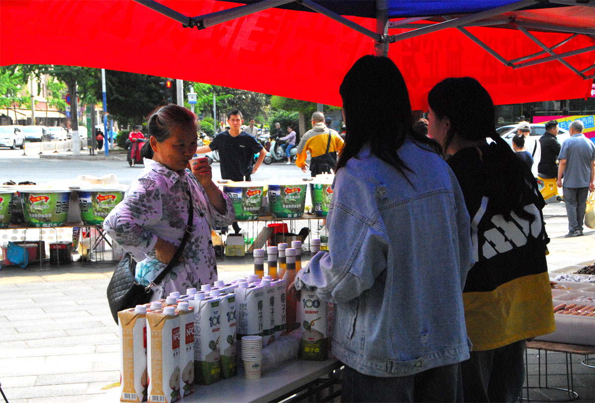 社企共建便民公益集市現場,“大馬邦”展出100%果汁、茶果醋、乳酸菌、桃膠等系列產品,現場熱情邀約廣大居民們試喝。并介紹了不同果汁飲料制作工藝和營養價值,讓居民們了解到健康飲食的重要性。